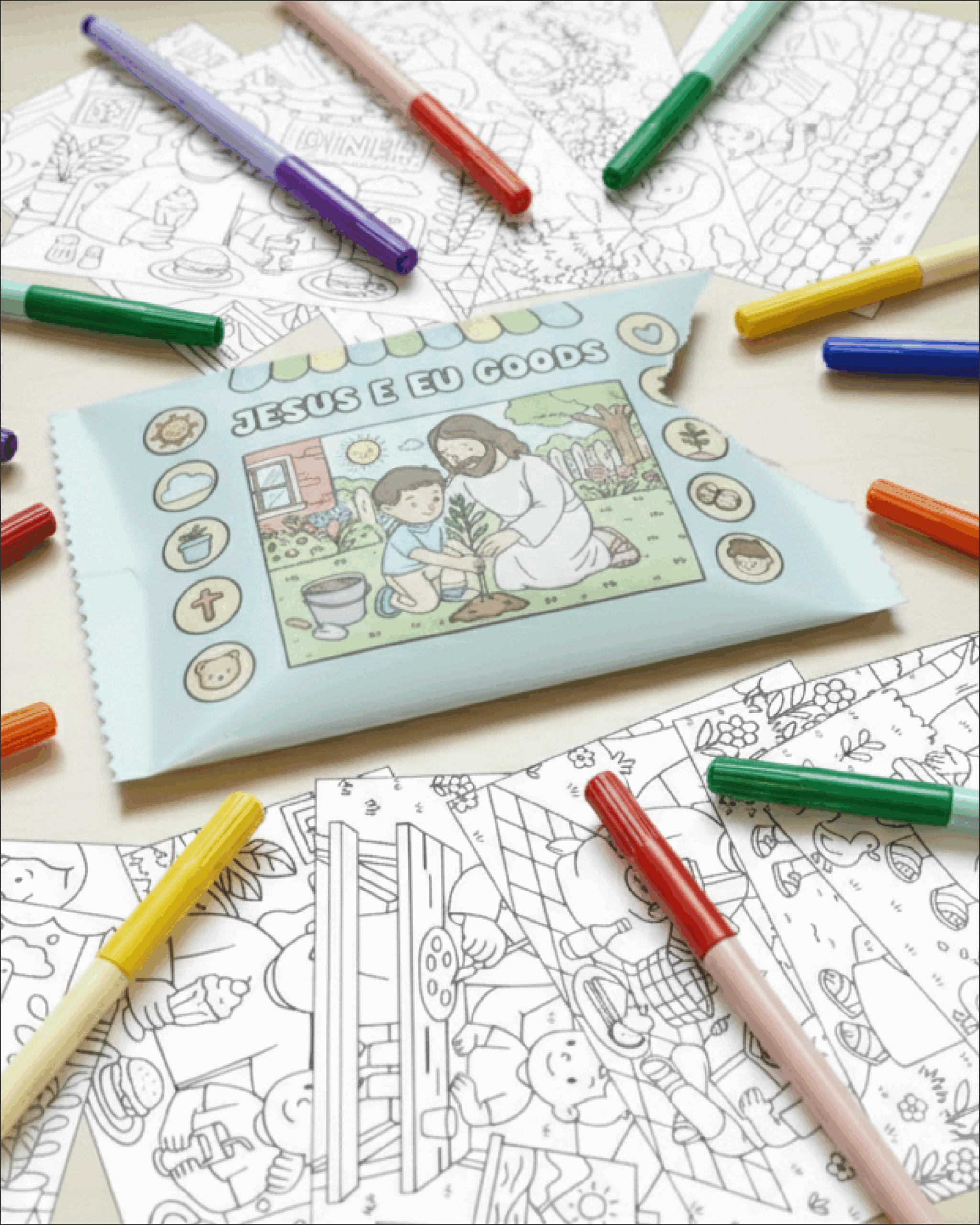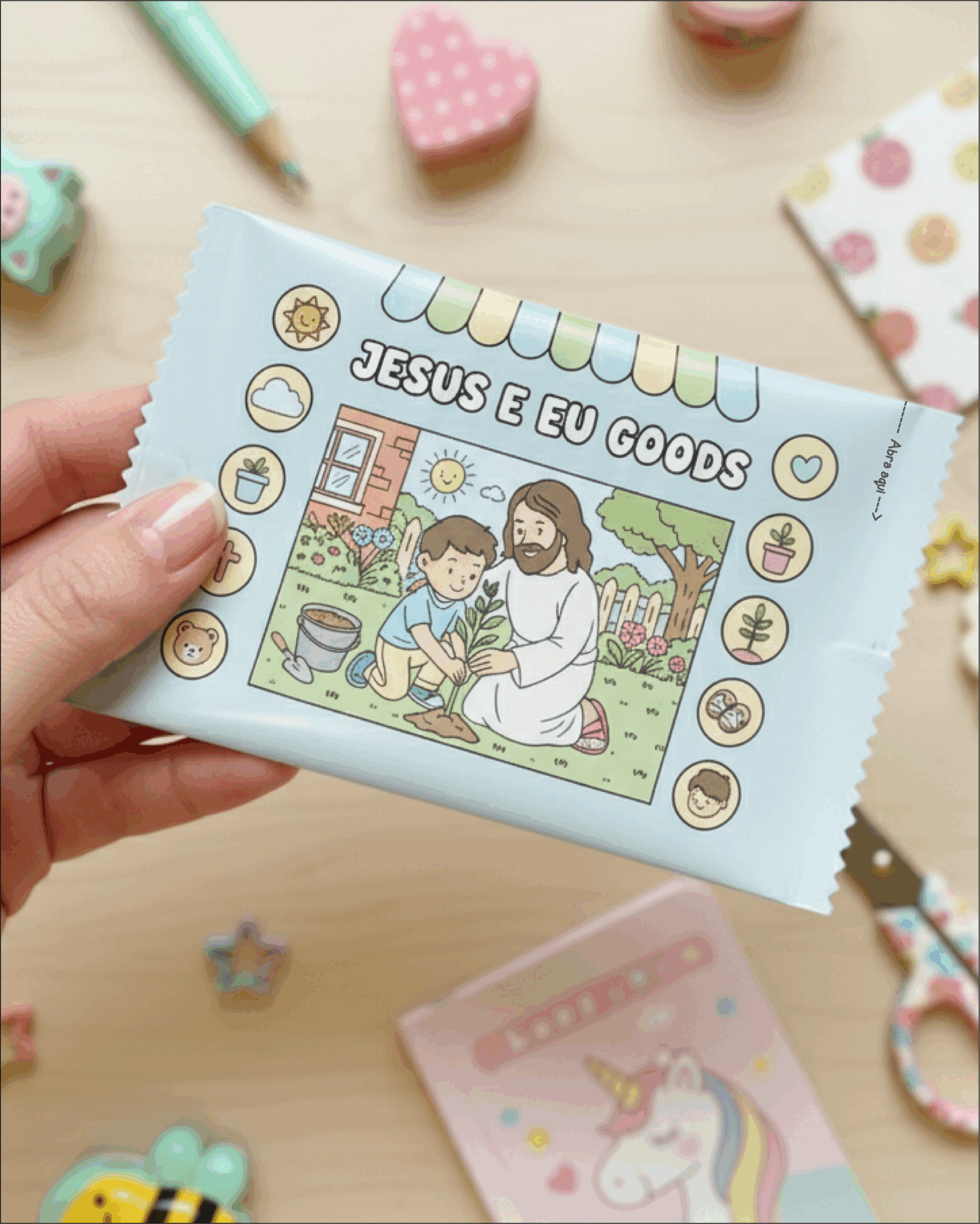 Um kit lindo, leve e cheio de fé, para aproximar as crianças de Jesus de um jeitinho divertido e muito especial.