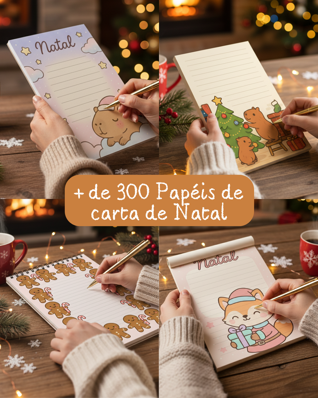 Com este super kit digital, você recebe + de 300 modelos exclusivos de papéis de carta de Natal, prontos para imprimir e escrever mensagens cheias de carinho e magia.