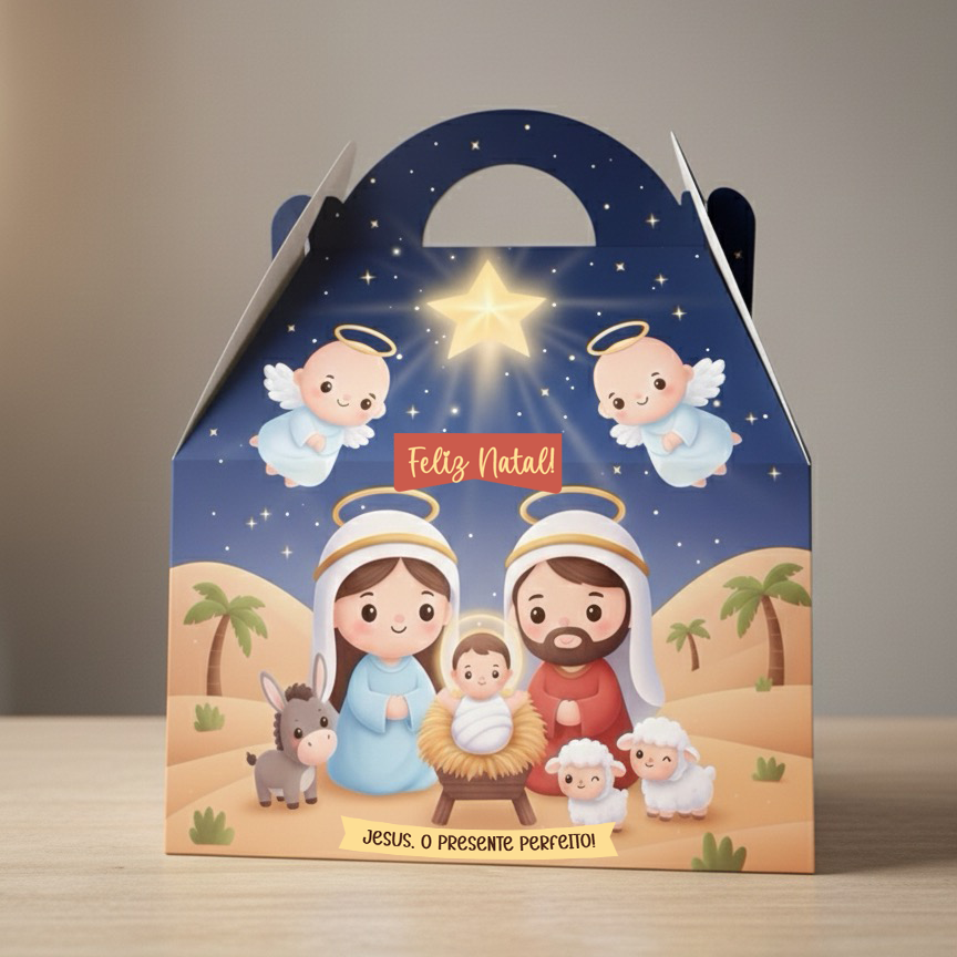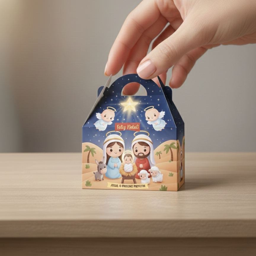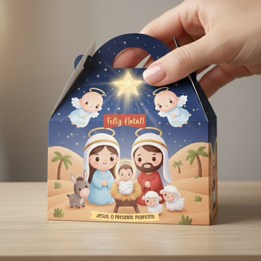 Maletinha caixinha temática de Natal cristão em PDF, pronta para imprimir e montar em casa.